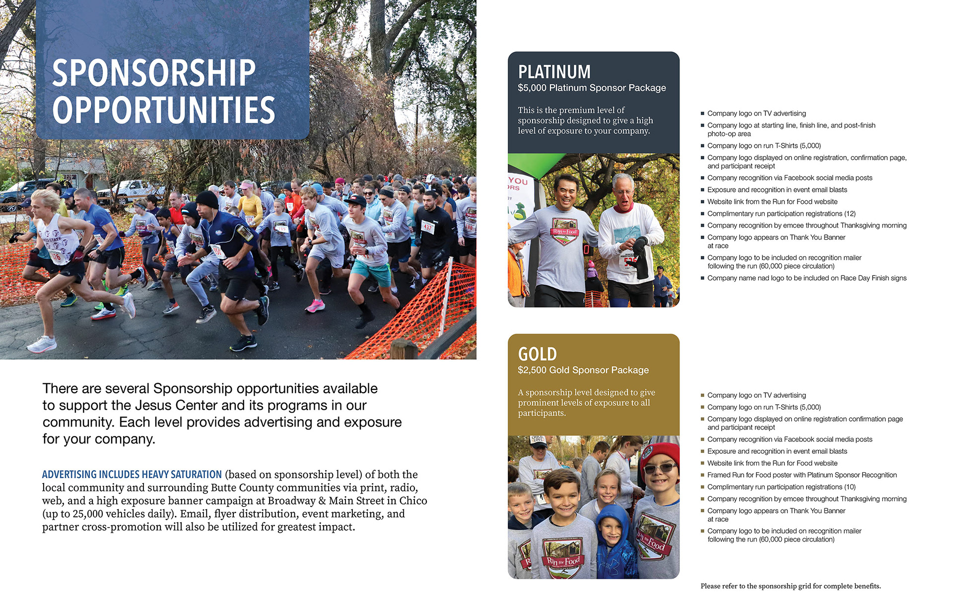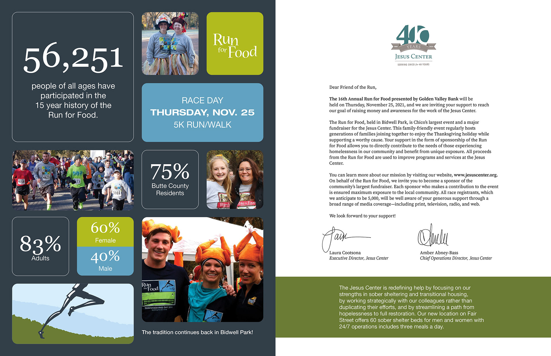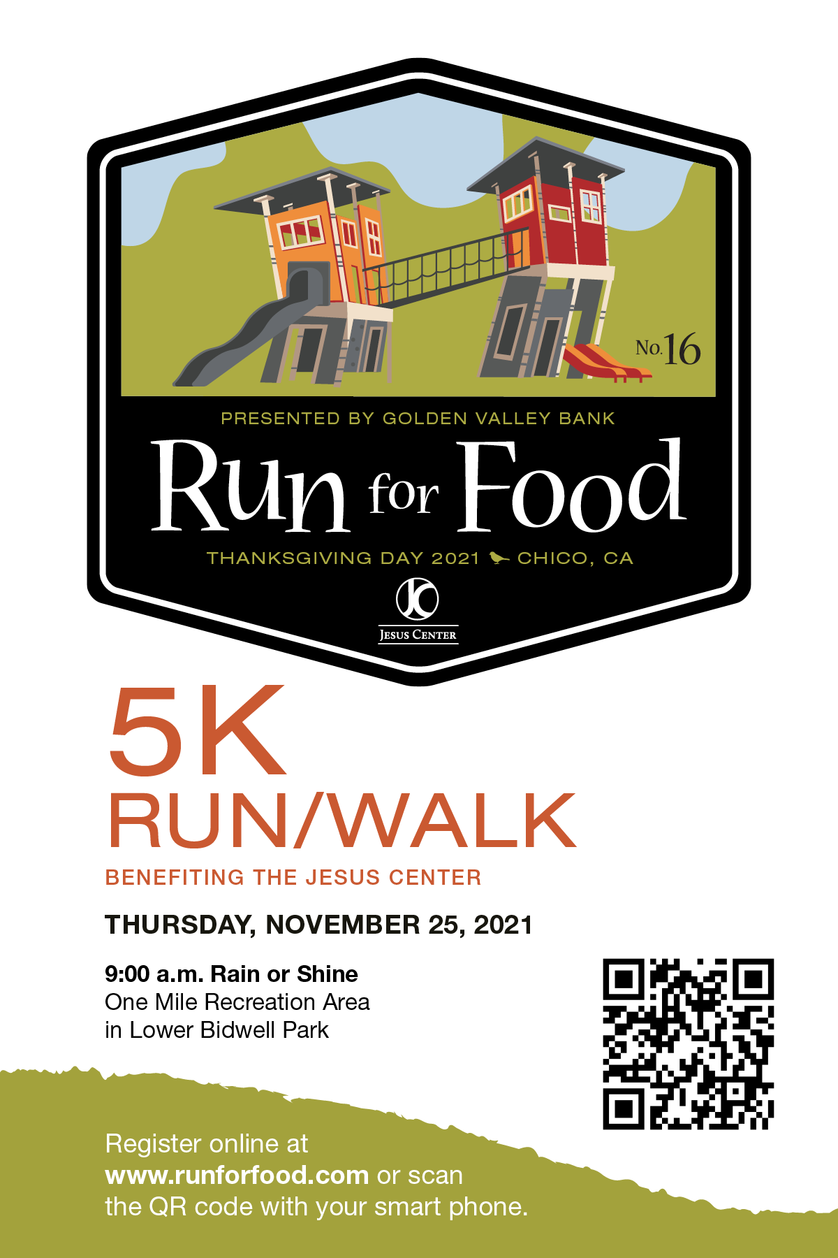 Run for Food is an annual 5K run held every Thanksgiving morning in Chico's Bidwell Park. Each year, an average of 5,000 people of all ages join together to raise money for a local nonprofit that supports the homeless and families in crisis.